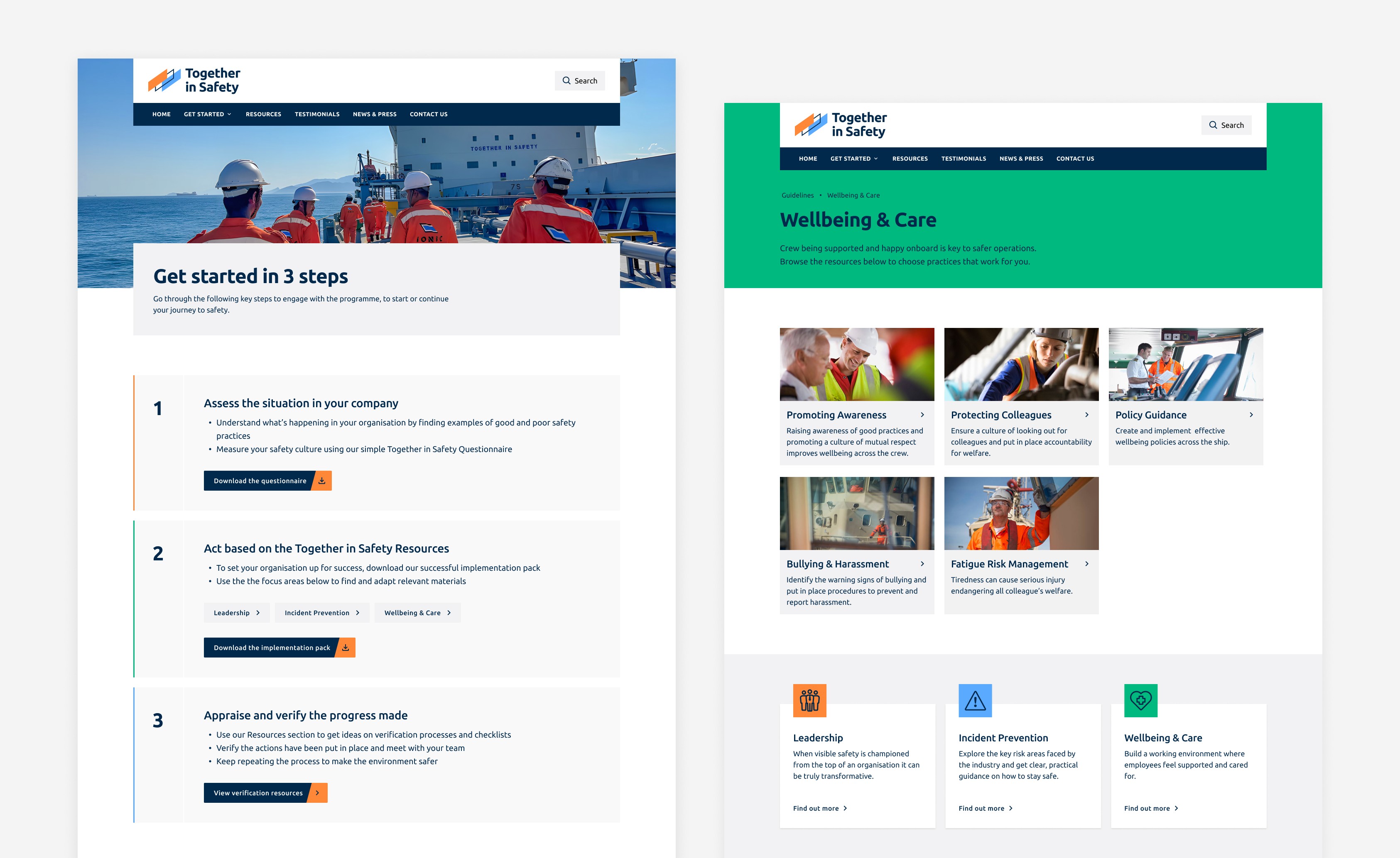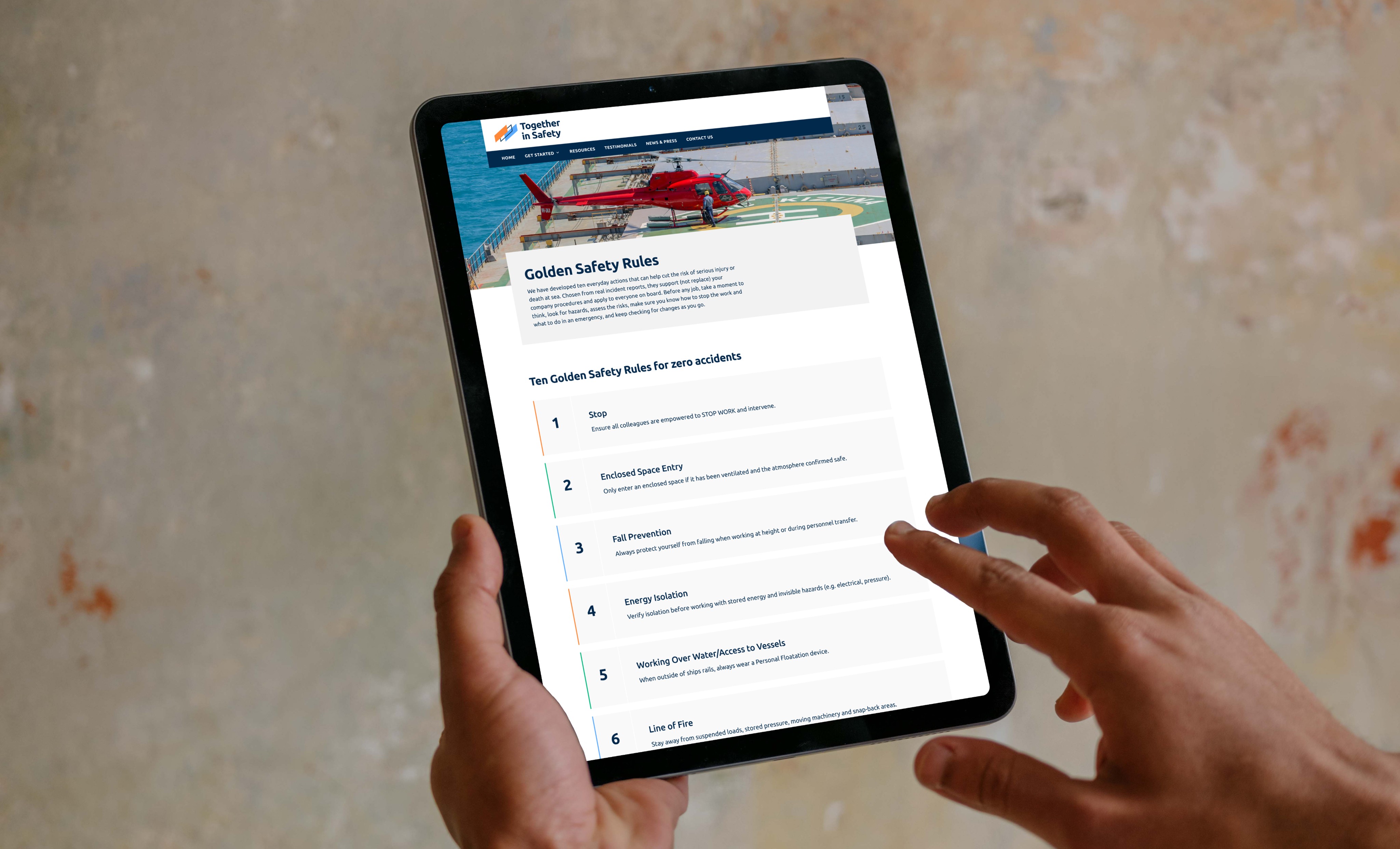 Together in Safety is a global maritime coalition focused on reducing incidents and improving safety culture across the shipping industry. They approached us to redesign their website so that critical safety knowledge could be shared more effectively across fleets, crew and organisations around the world.